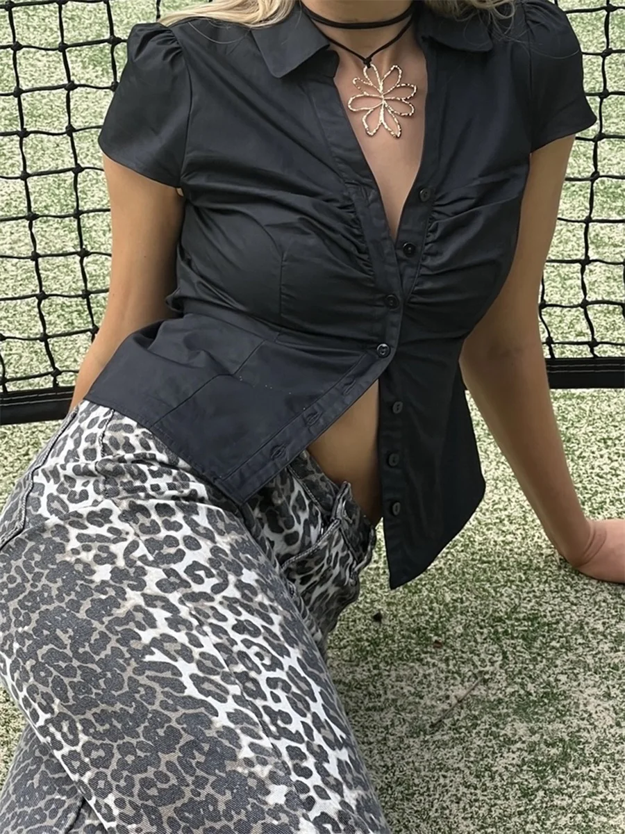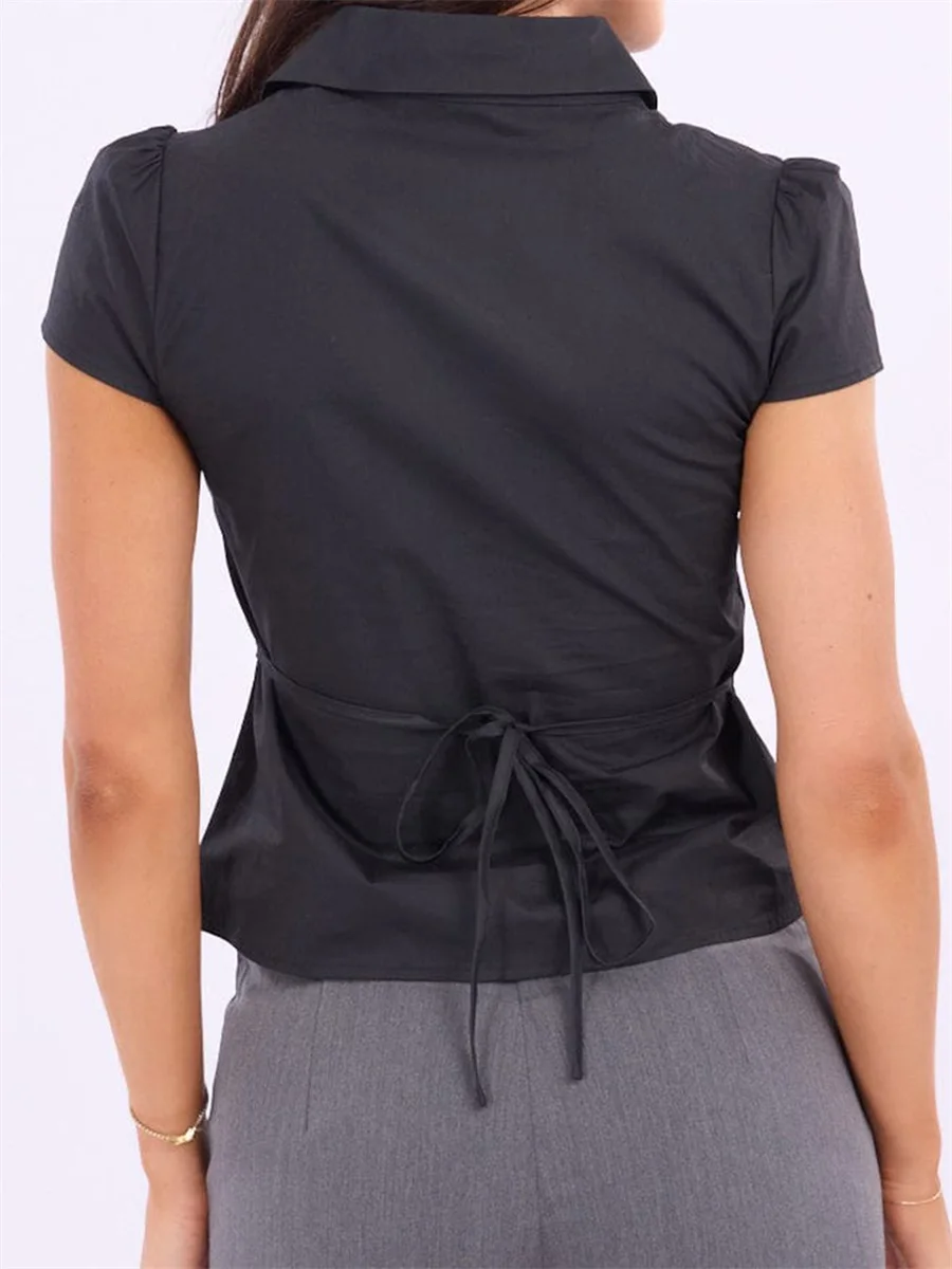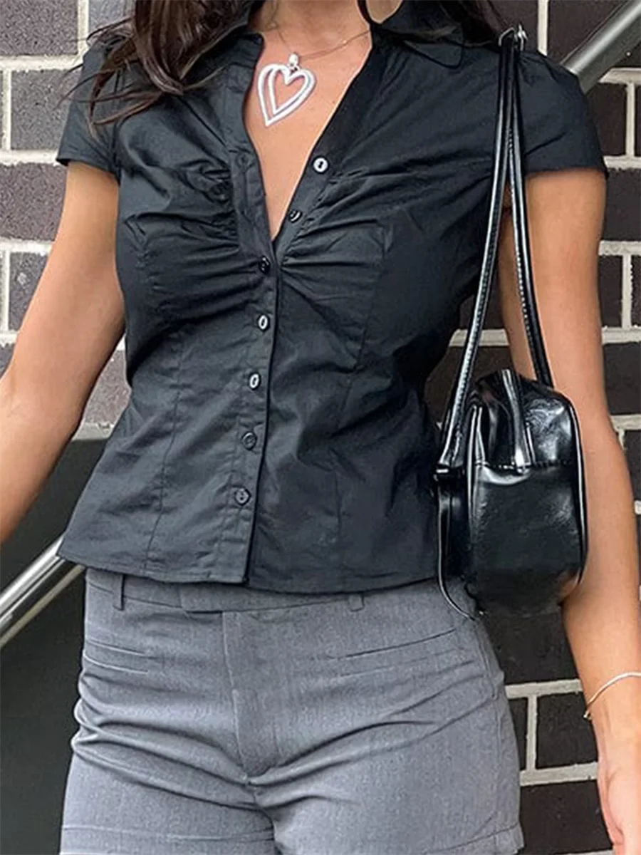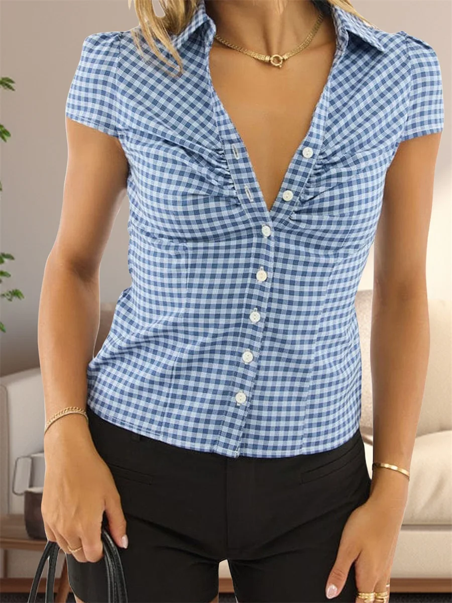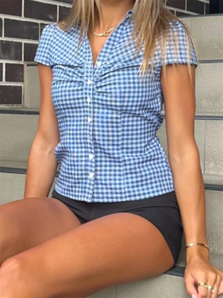 Women Shirt, Short Sleeve Button Closure Solid/Plaid Summer Tops Streetwear for Casual Daily