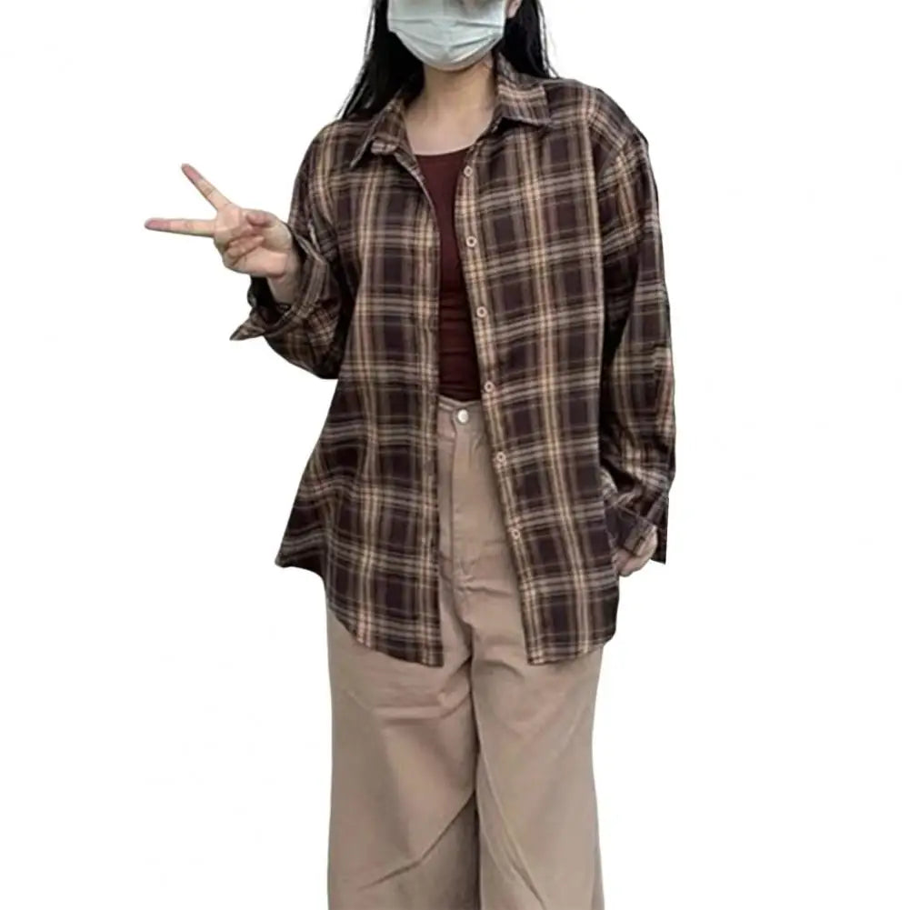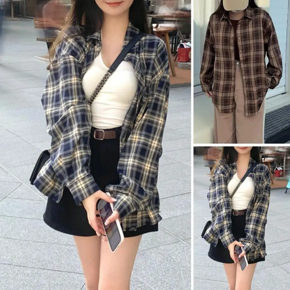 Women Shirt Lapel Long Sleeve Plaid Print Shirt Tops Buttons Placket Loose Fit Breathable Comfortable Shirt
