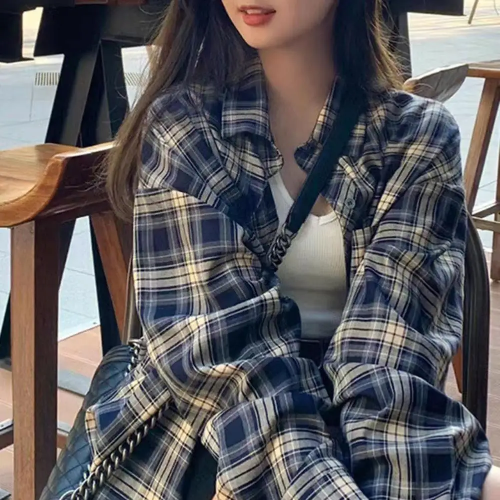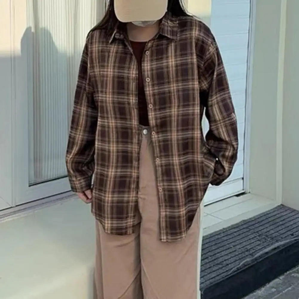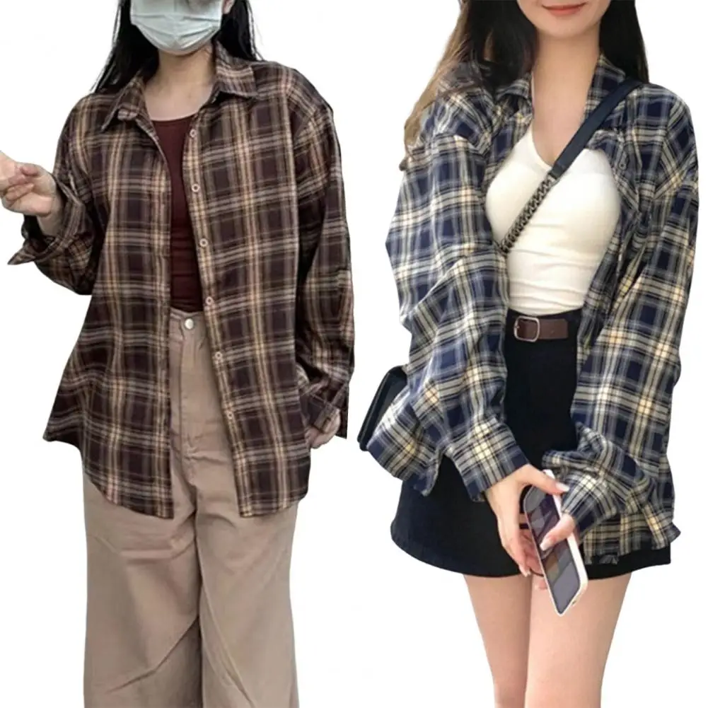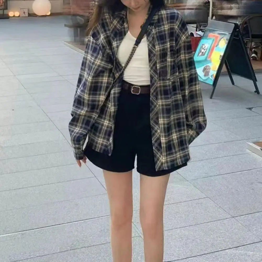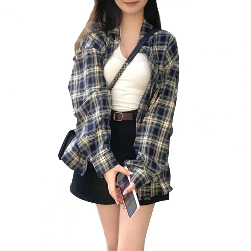 Elevate your style with this versatile Women's Shirt that can be worn alone or layered as a jacket over a T-shirt and vest. Featuring a trendy plaid design, this shirt exudes street-style vibes.