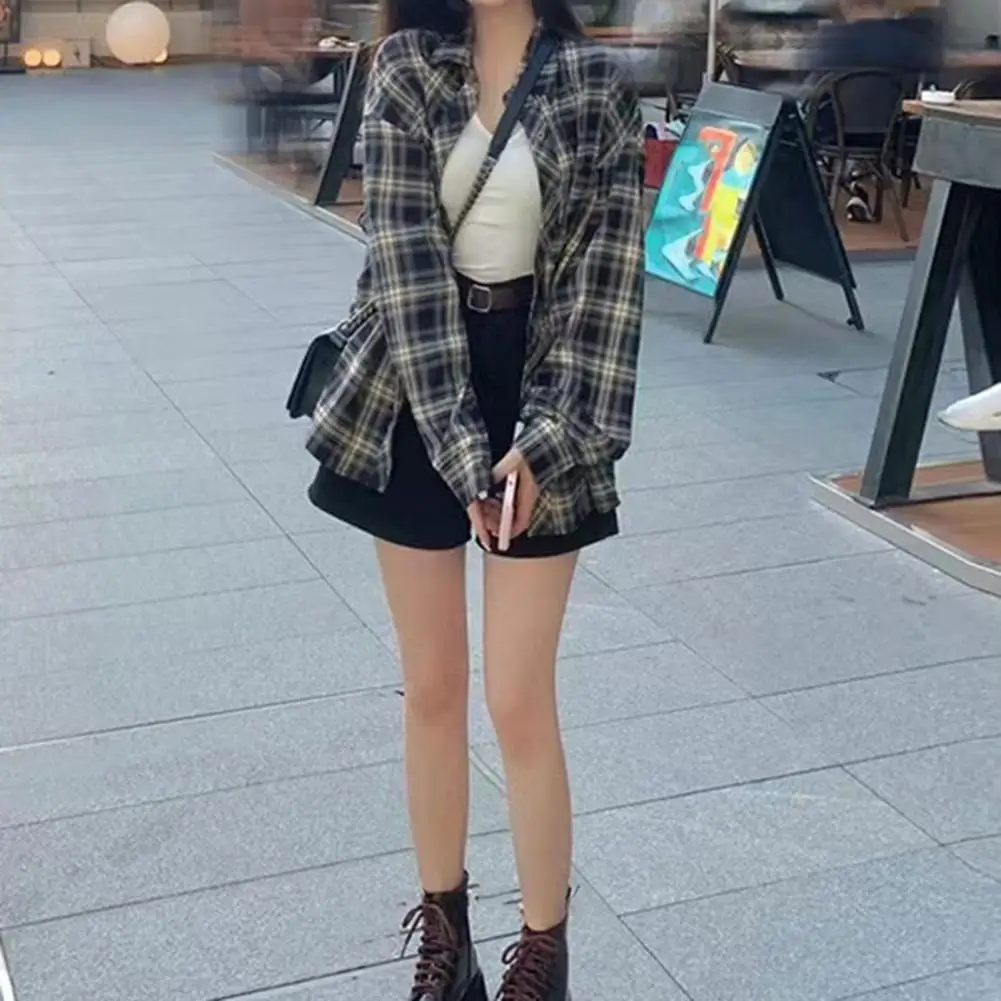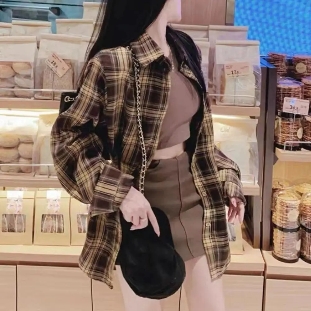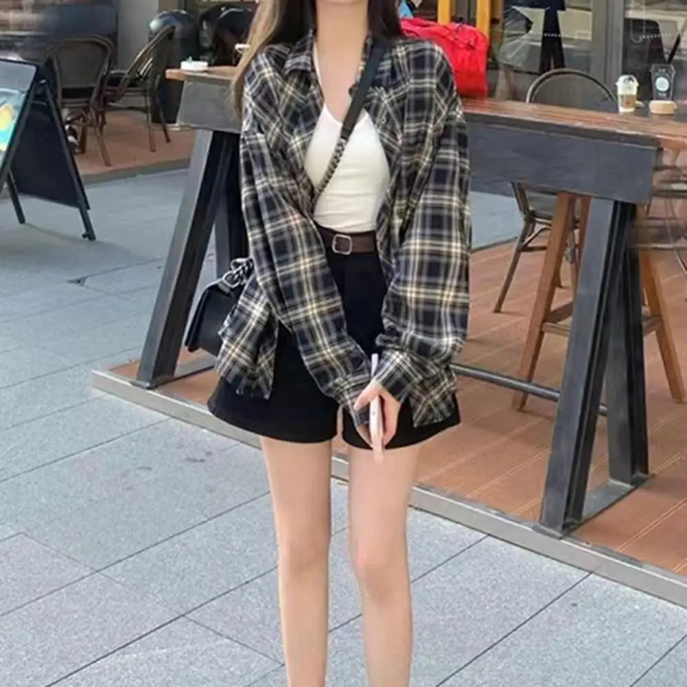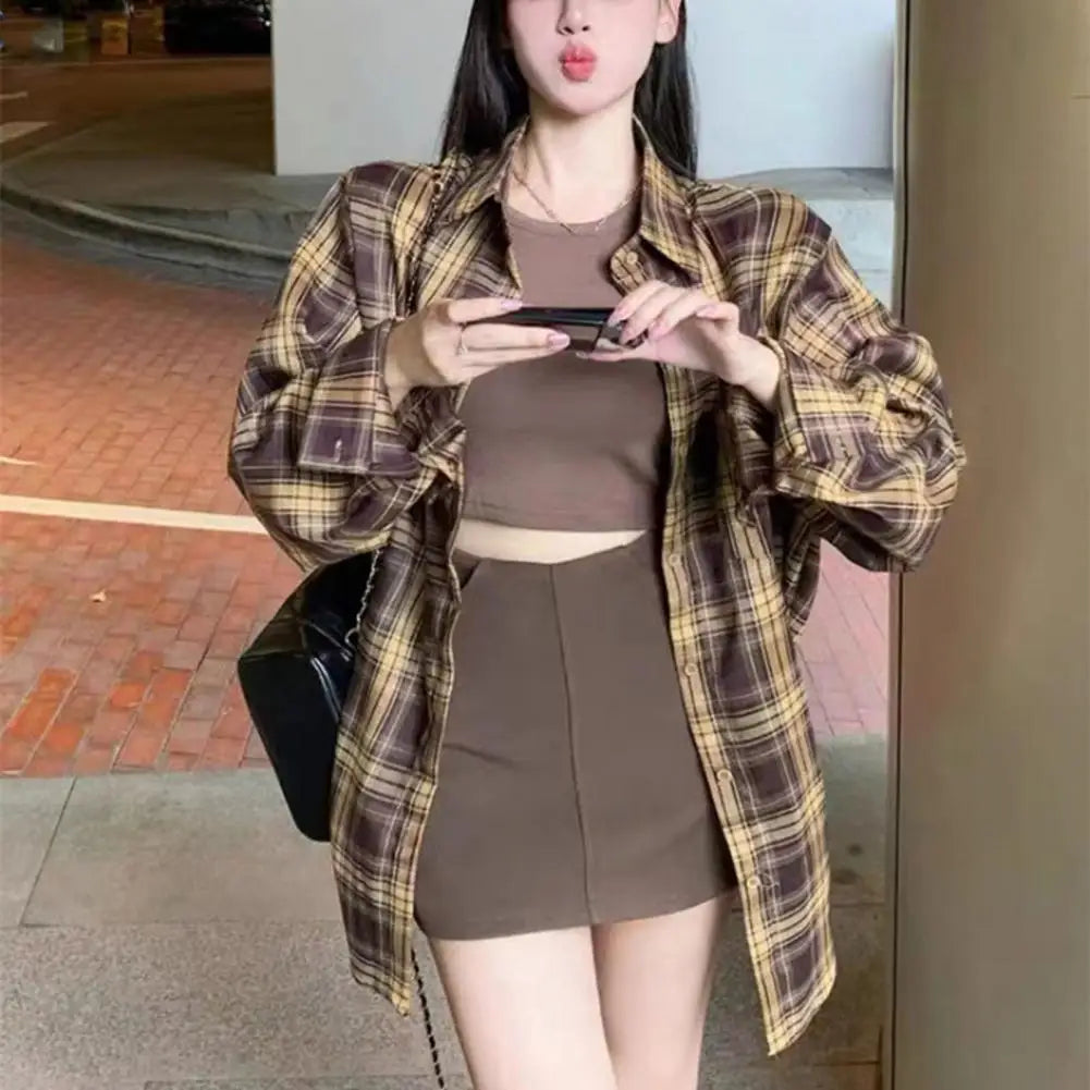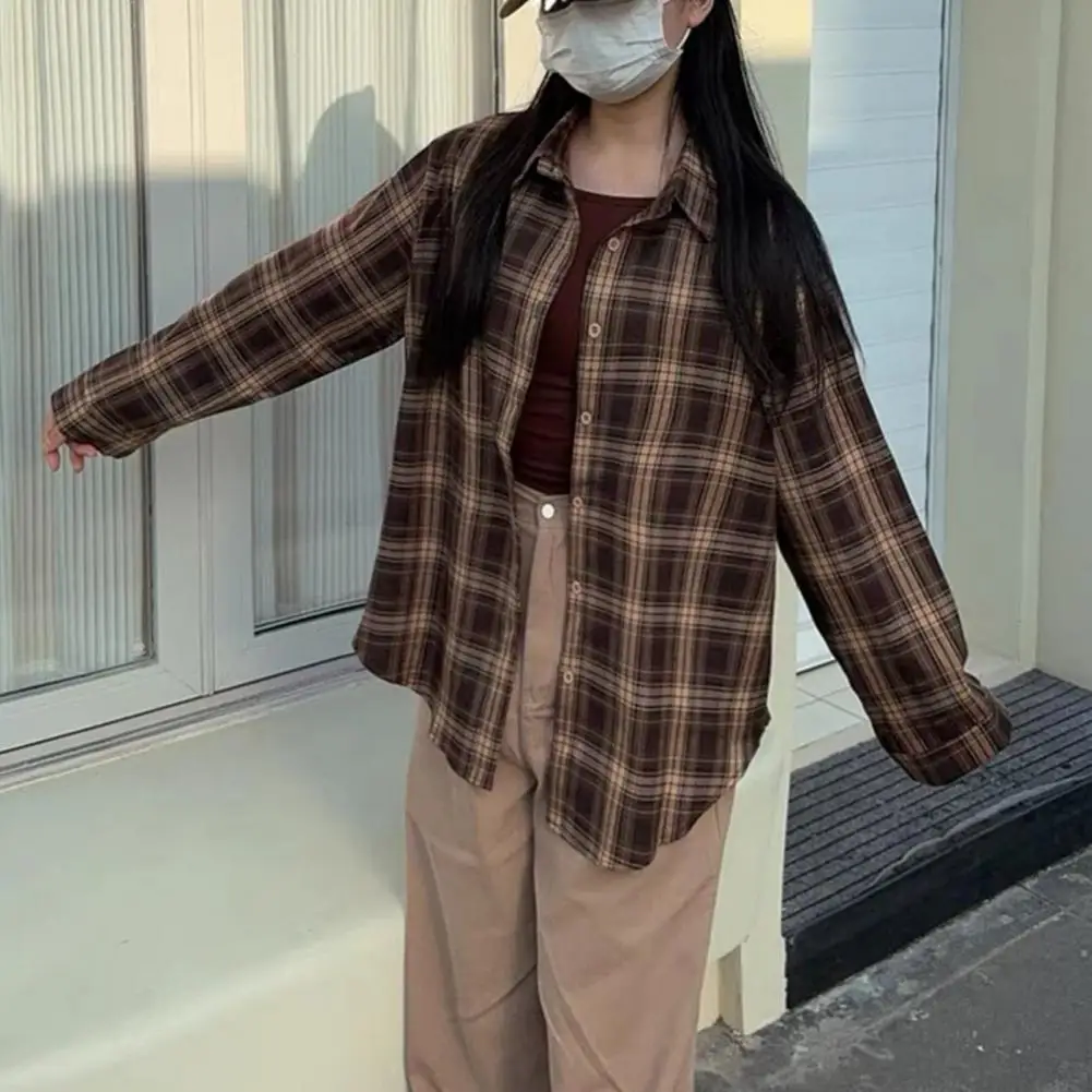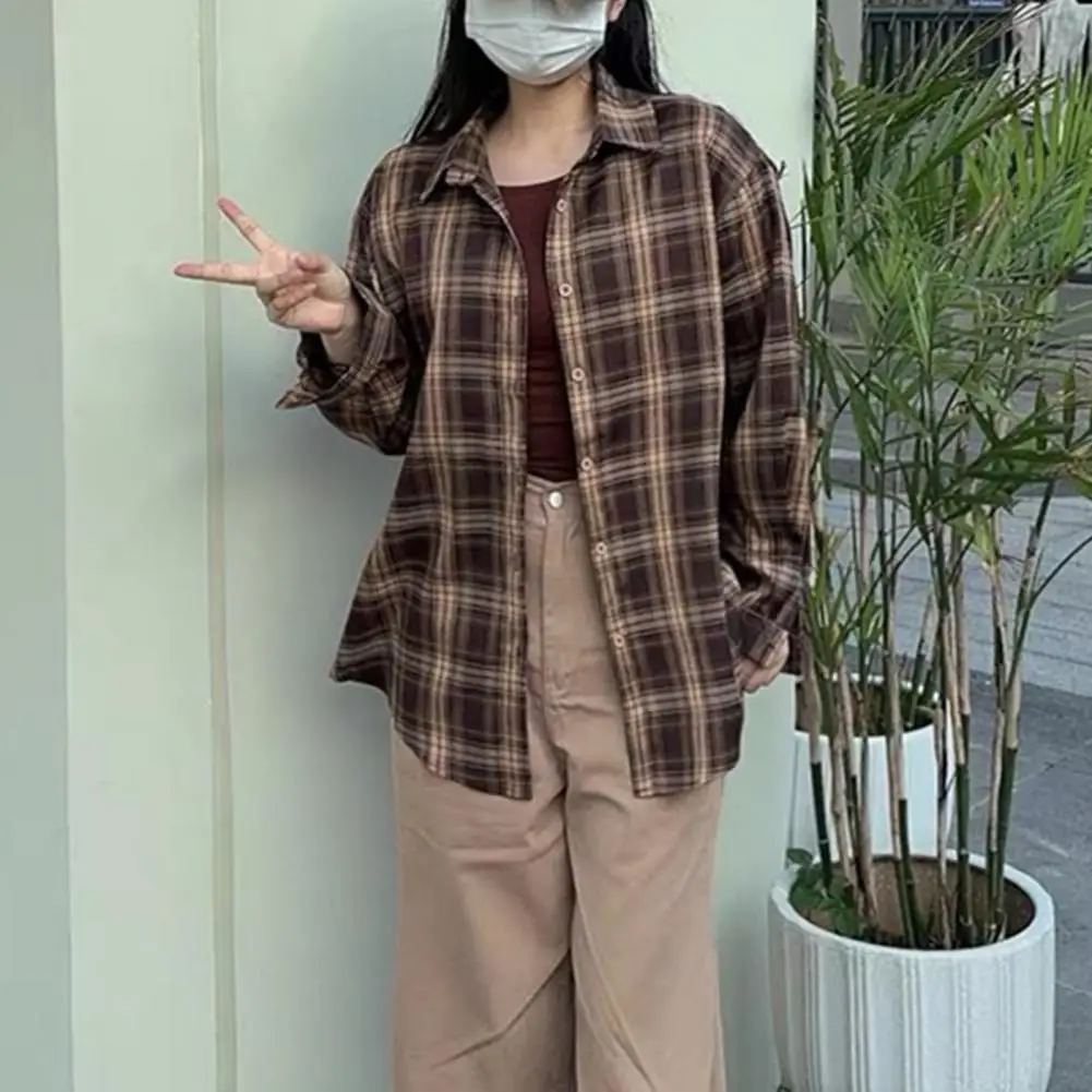 Elevate your style with this versatile Women's Shirt that can be worn alone or layered as a jacket over a T-shirt and vest. Featuring a trendy plaid design, this shirt exudes street-style vibes.